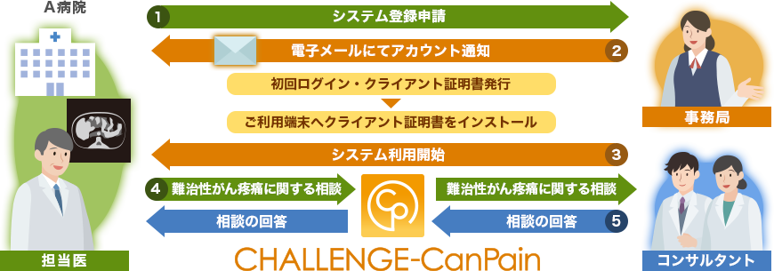 本システム「CHALLENGE-CanPain( Consultation Hub of speciAList-LinkagE of maNaGEment of difficult-to-treat Cancer Pain)」は、コントロールに難渋するがん疼痛の緩和のための遠隔コンサルティングシステムです。電子メールのような情報のやりとりを専用システムを用いて安全におこなうことができます。